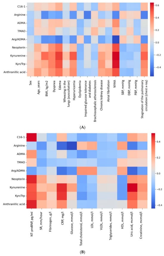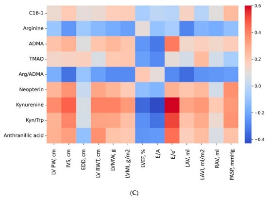 Higher levels of kynurenine (r = 0.445, p = 0.007) were associated with higher BMI; higher levels of hexadecenoylcarnitine (C16:1) (r = 0.505, p = 0.002), ADMA (r = 0.377, p = 0.023), anthranilic acid (r = 0.422, p = 0.010), neopterin (r = 0.379, p = 0.023) were correlated with higher NT-proBNP; lower levels of arginine (r = −0.526, p = 0.012) and TMAO (r = −0.563, p = 0.006) were associated with inflammatory markers with acceleration of ESR; higher levels of anthranilic acid (r = 0.426, p = 0.038), kynurenine (r = 0.566, p = 0.004) and kynurenine/tryptophan ratio (r = 0.459, p = 0.024) were associated with elevated C-reactive protein (CRP) levels; levels of tryptophan catabolism metabolites (anthranilic acid r = 0.454, p = 0.007, kynurenine r = 0.713, p < 0.001, kynurenine/tryptophan ratio r = 0.564, p < 0.001) and neopterin (r = 0.380, p = 0.026) were associated with uric acid levels; neopterin levels (r = 0.371, p = 0.026) were associated with creatinine levels; lower levels of C16:1 (r = −0.343, p = 0.040), arginine (r = −0.354, p = 0.034) and higher levels of kynurenine (r = 0.384, p = 0.021) correlated with glucose levels; lower levels of C16:1 correlated with lipid profile indicators, such as total cholesterol (r = −0.373, p = 0.030), LDL (r = −0.395, p = 0.028), VLDL (r = −0.536, p = 0.002), triglycerides (r = −0.438, p = 0.012); higher levels of TMAO were associated with HDL levels (r = 0.435, p = 0.016); lower levels of arginine/ADMA ratio were correlated with LV PW size, LVMW, LV and RA volume (r = −0.414, p = 0.012; r = −0.392, p = 0.018; r = −0.369, p = 0.029; r = −0.402, p = 0.015, respectively).