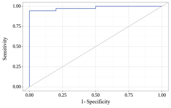 The regression model obtained was statistically significant (p < 0.001). Based on the Nigelkerk coefficient of determination, the model explains 87.4% of the variance in the “HFpEF” indicator. To assess the relationship between the probability of HFpEF and the logistic function P, we performed ROC analysis and obtained the following curve (Figure 4): The area under the ROC curve was 0.981 ± 0.017, with a 95% confidence interval (CI) of 0.948–1.000. The resulting model was statistically significant (p < 0.001). The threshold value of the logistic function P in the cutoff point corresponding to the highest Youden index was 64.7%. The presence of HFpEF was predicted when the p-value was greater than or equal to 64.7%. The sensitivity and specificity of our model were 94.4% and 100%, respectively. Compared to BNP as a single predictor, our model has better specificity (1.00 vs. 0.83) and sensitivity (0.94 vs. 0.80).