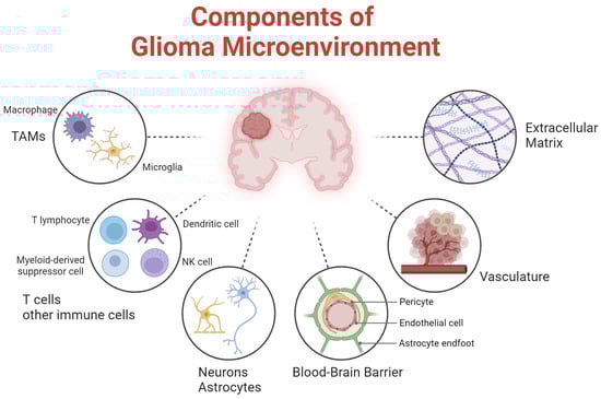 Schematic representation of the glioma microenvironment components. Key elements include immune components such as tumor-associated myeloid cells (TAMs), T lymphocytes and dendritic cells, and neural components including astrocytes and neurons. The extracellular matrix provides structural support, while the vasculature and blood-brain barrier, composed of endothelial cells, pericytes, and astrocyte endfeet, regulate nutrient exchange and immune infiltration.