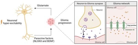 Neuron-Glioma interactions and tumor progression. Neuronal hyper-excitability and glioma progression are reciprocally linked. Neurons promote glioma growth through paracrine factors like NLGN3 and BDNF, while glioma cells enhance neuronal activity by releasing glutamate. Glioma cells also form neuron-to-glioma synapses, facilitating excitatory signaling, and establish an interconnected network via Connexin 43 gap junctions, enabling calcium signaling and tumor propagation.