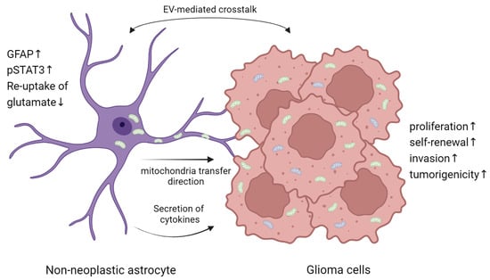 The analogous expression profiles identified between mouse astrocyte subpopulations and the classical, mesenchymal, and neural subtypes of human GBM, but not with the proneural subtype []. Additionally, the emergence of specific astrocyte subpopulations correlates with key aspects of tumor progression, such as invasion and the onset of seizures []. This process is marked by astrocyte reactivity and scar formation, characterized by upregulation of GFAP, cellular hypertrophy, and pSTAT3 activation in peritumoral astrocytes []. Consequently, reactive astrogliosis leads to impaired potassium and glutamate uptake, largely due to decreased Kir4.1 expression, ultimately resulting in neuronal hyperexcitability and tumor-associated epilepsy []. Priego et al. reported that a subpopulation of reactive astrocytes with STAT3 activation can actively reprogram the brain microenvironment, transitioning it from a naïve to a pro-metastatic state []. High levels of phospho-STAT3 in reactive astrocytes are furthermore associated with decreased survival in patients with intracranial metastases, highlighting its clinical significance. Consistent with this, pharmacological inhibition of STAT3 signaling within the microenvironment significantly reduces the burden of brain metastasis []. Intriguingly, astrocytes actively contribute to glioblastoma progression through metabolic crosstalk, including direct transfer of intact mitochondria to tumor cells. This process, mediated through GAP43-dependent intercellular structures, enhances the bioenergetic capacity of glioblastoma cells, promoting their proliferation and tumorigenicity [] (Figure 3).