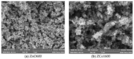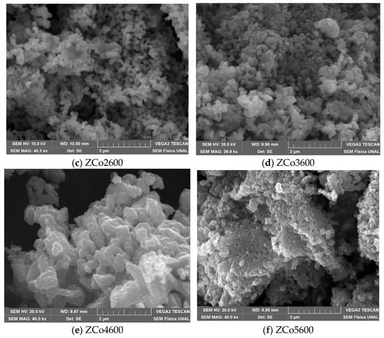 Figure 1 shows the SEM micrographs obtained from the pure and Co-doped zinc oxide samples. In all of them, the particles exhibit a spherical shape. Particle agglomeration is evident as a result of the calcination temperature used (600 °C). Porosity is also observed in all of them due to the formation of CO2, NO2, and H2O gases during the synthesis process [5,6], as shown in the chemical reaction expressed in Equation (10).