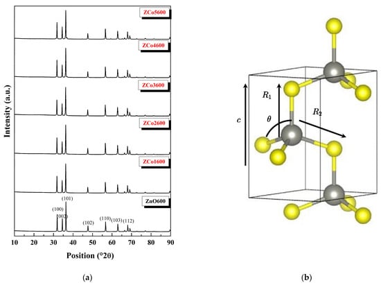 Figure 2a shows the X-ray diffraction pattern for both the undoped zinc oxide (sample ZnO600) and the same samples doped with cobalt for all of the studied concentrations. The seven most intense diffraction peaks, for all of the samples, correspond to the planes with Miller indices (100), (002), (101), (102), (110), (103) and (112), of the wurtzite-type hexagonal structure of ZnO (PDF-Card 36-1451 (International Centre for Diffraction Data, 2004)) [5]. No peaks associated with other possible structural phases are observed. Figure 2b shows the wurtzite structure of ZnO and highlights the tetrahedron where the Zn is located or where the substitutional dopant metal, Co, would be located in case of having a substitutional doping within the structure. It is an axial symmetry only in cases of having different distances between the metal and the oxygen located in the c direction of the tetrahedron, R1, and the metal with the neighboring oxygens at the base of the tetrahedron R2. These values, along with the value of the angle θ, as noted in Figure 1b, were evaluated by X-ray diffraction, using the equations expressed by Böttcher R, et al. [7].