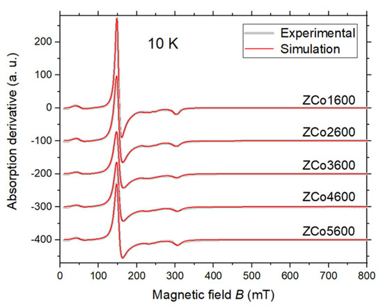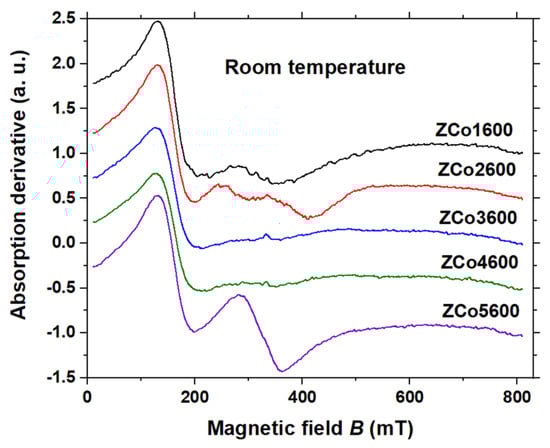 The X-band EPR spectra of sample ZCoX600, where X = 1, 2, 3, 4, and 5, acquired at room temperature, are depicted in Figure 3. All of the spectra exhibit similar characteristics, notably marked by significant broadening and structureless spectral features. Despite intriguing disparities among the spectra, no efforts have been made to simulate them based on a comprehensive physical model, which is out of the scope of this work.