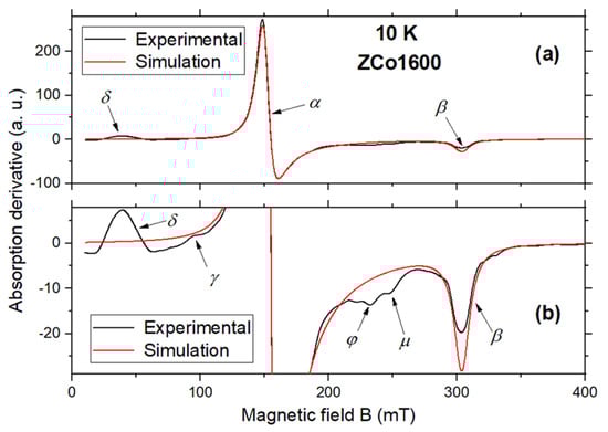 To facilitate a clearer examination, the spectrum of sample ZCo1600 is reproduced in Figure 5a, accompanied by a magnified view around the baseline in Figure 5b. Here, the three aforementioned features are labeled as α, β and δ, respectively. Furthermore, the magnification allows for the identification of a minor bump at 95 mT, denoted by γ, along with two additional bumps around 235 mT, labeled as φ and μ. Although other less intense features may be discerned, they were disregarded due to their very weak amplitudes.