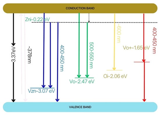 Several types of defects can be found in ZnO. Some of them are native, such as zinc (VZn) and oxygen (VO) vacancies, Zn and O interstitials (Zni and Oi, respectively), Zn and O antisite defects, and charged oxygen vacancies Vo-, among others. All of them have energy levels located within the bandgap of the parent material, ZnO. Figure 7 shows the energy levels associated with these defects, as calculated by several authors [1,2,3,4]. When transitions occur from the conduction band to the valence band of ZnO, the transition energy is in the ultraviolet, ≈3.27 eV, equivalent to the ZnO bandgap. Zni defects are located 0.22 eV below the conduction band. The possible transitions between the different levels are shown in Figure 7. Therefore, it is necessary to combine different defects in ZnO in order to have a photocatalyst activated by several energies within the visible region of the spectrum.