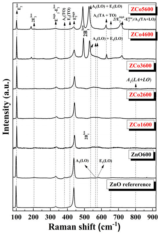 Raman spectra for the calcined materials, for different dopant cobalt concentrations and the reference ZnO sample, are shown in Figure 8. The wurtzite ZnO has the irreducible representation Γopt = A1 + E1 + 2E2 + 2B1; the B1 modes are Raman silent, while the A1 y E1 modes are polar and the E2 modes are non-polar and Raman active. The low frequency E2low mode mainly involves Zn motion, while E2high is related to oxygen motion. The A1 modes can hardly be detected for excitation wavelengths above 400 nm. The Raman spectrum recorded under our experimental conditions in the ZnO reference is dominated by the non-polar modes E2low (99 cm−1) and E2high (437 cm−1), with a weak contribution of a peak at 333 cm−1, which can be associated with an E2high-E2low overtone. The incorporation of Co produces changes in the spectrum: one observes a progressive intensity decrease and broadening of the E2high zone center mode, which suggests lattice symmetry breakdown affecting the oxygen sublattice. The E2low mode is more stable, and one observes a significant intensity decrease for the highest Co concentration. Significant spectral changes are observed for samples ZCo4600 and ZCo5600, where several overtones are activated by the lattice distortion introduced by the presence of a significant incorporation of Co. For a description of the main modes present in ZnO, see Cuscó et al. [16]. One should pay special attention to the peaks 530 cm−1 and 723 cm−1, which have been related to 2B1low and LA-TO with A1 symmetry overtones, respectively [16]; however, they have been also related to local vibration modes (LVMs) associated with cobalt, in particular a complex of cobalt with a donor for the 530 cm−1 peak [17] and to substitutional Co in the ZnO lattice [18]. There are two additional bands located at ≈ 490 cm−1 and 540 cm−1, associated with lattice defects: oxygen vacancies (VO) and zinc interstices (Zni), respectively, which have their energy levels within the ZnO bandgap, according to Samadi et al. [4] (see Figure 8 and Figure 9).