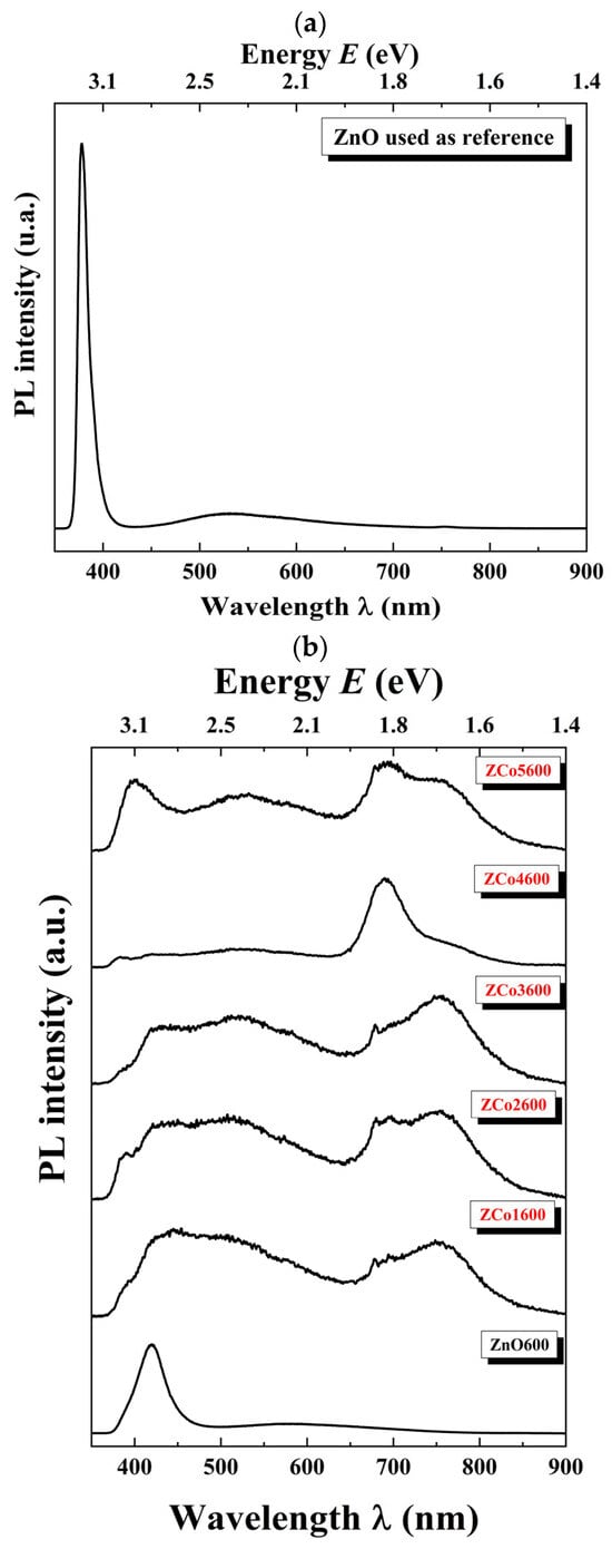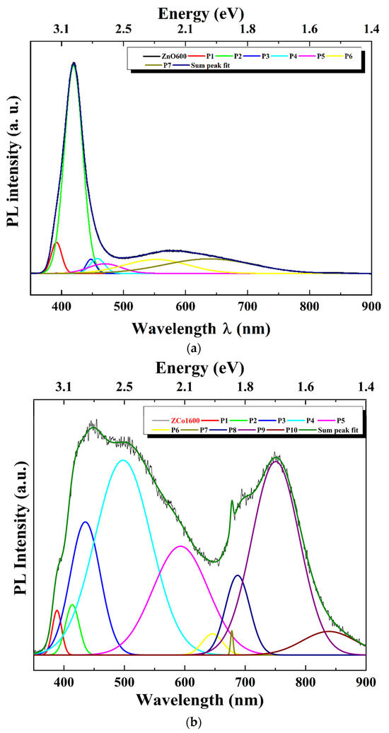 In order to further study the peaks observed with this spectroscopic technique, a Gaussian deconvolution adjustment was performed on each PL spectrum, as shown in Figure 10 for the zinc oxide sample (Figure 10a) and the 1% at. Co-doped ZnO sample (ZCo1600, Figure 10b). The results obtained from the adjustment are recorded in Table 3.