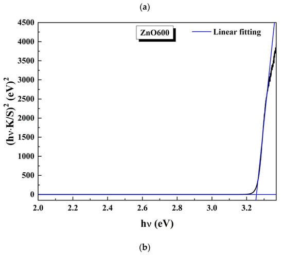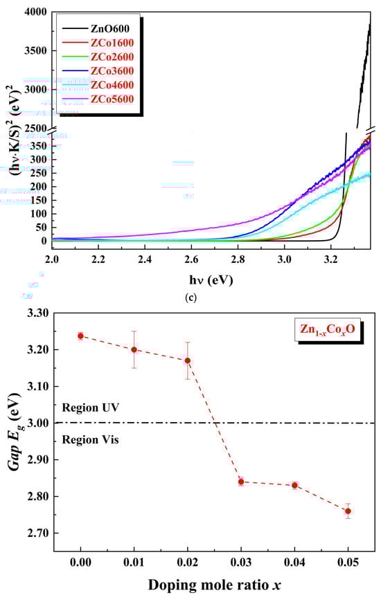 Figure 11a,b show the modified Tau plot curves of the pure ZnO samples and cobalt doped samples. They were obtained from reflectance spectra measured in the range 350–800 nm and modified by using the Kubelka–Munk equation [21,22], Equation (9), plotting (k/s∙hv)2 as a function of hv. The bandgap is determined by extrapolating the linear portion on the plot when k = 0: