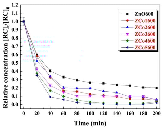 Plots of relative [RC]t/[RC]0 concentrations as a function of time for pure ZnO (black dots) and cobalt doped ZnO.
