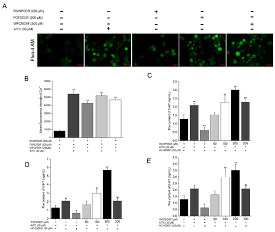 THP and AITC treatments of RIN-14B cells induce Ca2+ influx and 5-HT release and are positively modulated by the TRPA1 channel. (A,B) Fluorescence and its relative quantification for Ca2+ concentration upon THP and AITC treatments (n = 3). The release of 5-HT from RIN-14B cells with RCWPDCR (C), FGFDGDF (D), WFCEGSF (200 μM) (E), and AITC, a TRPA1 agonist (30 μM), along with the inhibition of the TRPA1 channel with HC-030031 (30 μM) (n = 3). Scale bar: 25 μm. Quantification data represented as mean ± SD. One-way ANOVA was applied for statistical analysis. * p < 0.05 vs. control; ** p < 0.01 vs. control; ## p < 0.01 vs. 200 μM THPs.