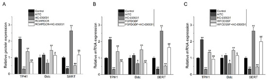 The RT-qPCR validation in the examination of the effects of the TRPA1 agonist AITC (30 μM), the TRPA1 inhibitor HC-030031 (30 μM), THPs (200 μM), and THPs (200 μM) + HC-030031 (30 μM) on the levels of the genes related to the 5-HT synthesis pathway, TPH1, SERT, and Ddc (n = 3). (A) RCWPDCR regulated the expression of the TPH1, Ddc, and SERT genes related to the 5-HT synthesis pathway. (B) FGFDGDF regulated the expression of the TPH1, Ddc and SERT genes related to the 5-HT synthesis pathway. (C) WFCEGSF regulated the expression of the TPH1, Ddc, and SERT genes related to the 5-HT synthesis pathway. * p < 0.05 vs. control; ** p < 0.01 vs. control; # p < 0.05 vs. 200 μM THPs; ## p < 0.01 vs. 200 μM THPs.