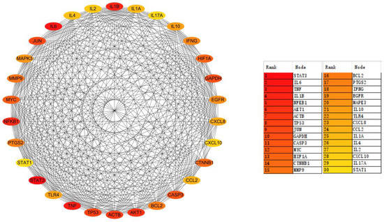 To explore the associations between the common targets of AD and medicine food homology plants, 623 common targets were entered into the STRING database to construct a PPI network [26]. The PPI network was visualized using Cytoscape [27], and topological analysis was performed using the MCC method with the cytoHubba plugin (v0.1), resulting in the identification of the top 30 crucial targets. The interactions and scores of these targets are shown in Figure 1. Among them, signal transducer and activator of transcription 3 (STAT3), interleukin-6 (IL6), tumor necrosis factor (TNF), and interleukin-1 beta (IL1B) were ranked as the top four targets, suggesting that they may play critical roles in AD treatment using medicine food homology plants.