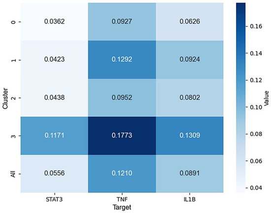 Among the top four crucial targets, we focused on investigating the binding capabilities of small molecules with STAT3, TNF, and IL1B because the most currently identified IL6 inhibitors are antibodies that exhibit more complex binding mechanisms than small molecules. The ConPlex algorithm was used to predict the binding capabilities between the small molecules and the targets STAT3, TNF, and IL1B. ConPlex is a sequence-based prediction model for drug–target interactions [43]. The predicted scores range from 0 to 1, with higher scores indicating stronger binding between the small molecules and the targets. The predicted scores are listed in Table S2. A classification scatter plot was used to visually present the prediction results (Figure 4), in which the binding predicted scores between each small molecule and target were quantified and represented as individual data points. As shown in the figure, Cluster 3 exhibited stronger predicted binding scores with the three targets than the other clusters, with a greater number of small molecules falling within the high-value region (above the average).