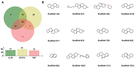 (A) Venn diagram showing the overlap of small molecules with predicted binding scores above the mean value for IL1B, TNF, and STAT3. (B) Statistical analysis of the scaffolds of the 46 small molecules, with the corresponding number of molecules for each scaffold indicated in brackets. The oxygen atom is represented in red.