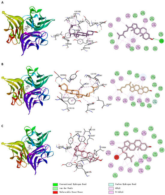 As shown in Figure 11, for TNF, MOL005439, MOL000953, and MOL005438 formed alkyl/pi–alkyl interactions with LEU57, TYR59, TYR119, ILE155, and other residues and Van der Waals interactions with ILE58, GLY121, and nearby residues. Notably, MOL000953 formed carbon–hydrogen bonds with SER60, whereas MOL005439 formed conventional hydrogen bonds with the same residue. This hydrogen bond may explain the higher calculated predicted binding affinity of MOL005439 to TNF.