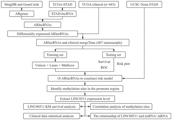 In this article, we investigated the relationship between angiogenesis-related lncRNAs (ARlncRNAs) and DNA methylation in stomach adenocarcinoma (STAD). We integrated ARgenes in the MSigDB and GeneCard database, and screened out ARlncRNAs. Combined with the clinical data of STAD patients provided in TCGA database, 18 critical ARlncRNAs were identified for the prognosis of STAD patients. In addition, we explored the methylation sites in promoter regions of 18 ARlncRNAs and found 11 methylation sites in the promoter region of LINC00511. We further examined the expression and methylation of LINC00511 in STAD. The workflow of our study is shown in Figure 1.