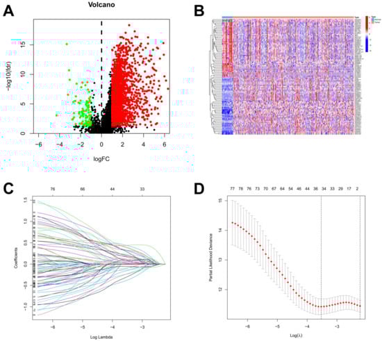 Based on the lnRNAs annotated in the Genecode website, 16,876 lncRNAs were extracted from the TCGA dataset. Through a co-expression analysis, 4664 out of 16,876 lncRNAs were identified and designated as ARlncRNAs in STAD. The 2108 differentially expressed ARlncRNAs between STAD patients and normal samples from 4664 lncRNAs were identified, including 2007 up-regulated ARlncRNAs and 101 down-regulated ARlncRNAs (Figure 2A). The visualization of the expression patterns of the 50 differentially expressed ARlncRNAs that were most significantly up-regulated and down-regulated was shown in Figure 2B. There was a significant difference in the expression of ARlncRNAs between STAD tumor tissues and normal stomach tissues. A lasso regression analysis was performed on the 80 differentially expressed ARlncRNAs associated with prognostic survival ARlncRNAs from a univariate Cox analysis for in-depth contraction and selection (Figure 2C,D).