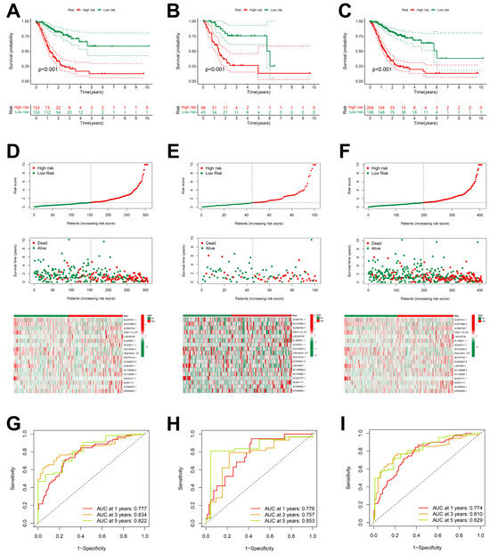 Prognostic characteristics of 18 ARlncRNAs in the TCGA. (A–C) Survival curves for STAD patients categorized into high-risk and low-risk groups across the training group, validation group, and overall dataset; (D–F) risk scores, survival status, and risk heatmaps of three groups of STAD patients; and (G–I) ROC curves of three groups of STAD patients.