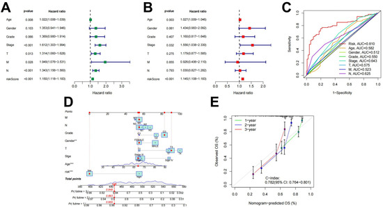 Independent prognostic value of . (A) Results of the univariate Cox independent prognostic analysis; (B) results of the multivariate independent prognostic analysis; (C) timeROC curve; (D) a nomogram designed to predict overall survival (OS) in patients with STAD; and (E) C-index curves for predicting 1-, 2-, and 3-year survival rates (** *** ).