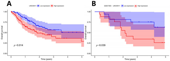 Patients were ranked according to the expression level of LINC00511 from high to low. The patients with the top 25% were defined as high-expression samples and the patients with the bottom 25% were defined as low-expression samples. Kaplan–Meier survival analyses were shown in Figure 5A. The results indicated that patients with a lower expression of LINC00511 had better OS. To validate this finding, we applied the same method to classify LINC00511 expression into high and low groups in the independent sample GSE57303 and performed a survival analysis. The results showed that patients in the low expression group of LINC00511 had significantly better OS compared to those in the high expression group (Figure 5B), further confirming the association between a low expression of LINC00511 and improved prognosis in cancer patients. By comparing LINC00511 expression between STAD and adjacent normal tissues from TCGA, we found that the expression of LINC00511 was higher in tumors than normal tissues (p = 1.5 × 10−8). This result is consistent with the high expression of LINC00511 in a variety of cancers [17,18,19]. Therefore, inhibiting LINC00511 expression may be helpful for the treatment of STAD.