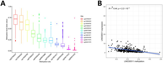 DNA methylation and Spearman correlation analysis. (A) Ranking of methylation levels at 11 CpG sites from high to low; (B) the relationship between the expression levels of LINC00511 and the methylation levels of CpG sites.