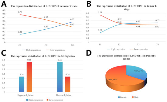 The clinical characteristics were divided into subgroups and the number of people in each subgroup was calculated. The number of patients with high and low expression in each subgroup was calculated according to the median value of gene expression, and the percentage of high/low expression in the clinical subgroup was calculated. The distribution of different clinical characteristics is shown in Figure 6. The high expression levels of LINC00511 were associated with high-grade tumors. A higher percentage (57%) of G3 tumors had high LINC00511 expression, compared to G1 and G2 tumors (Figure 7A). Similar trends were also observed for the T staging of tumors, with the percentage of patients with a high expression of LINC00511 increasing with increasing tumor volume (Figure 7B). More patients with high methylation had low LINC00511 expression compared to those with a low-methylation tumor (Figure 7C). In addition, the number of male patients is much higher than that of females (Figure 7D), which might be associated to the eating habits and behaviors of males [20].