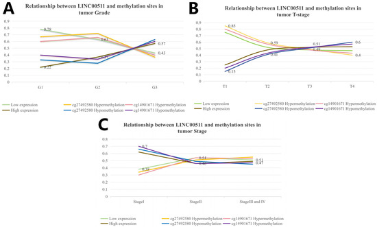 Using the above calculation method, we analyzed the correlation between DNA methylation in 10 methylation sites and clinical characteristics in stomach adenocarcinoma. Our study showed that hypomethylation of cg27492584 was significantly associated with high-grade tumors (p = 1.4 × 10−9). In G3 tumors, the percentage of cg27492584 hypomethylation was higher (63%) and the trend of cg27492584 hypermethylation was consistent with the trend of low LINC00511 expression. By calculating the distribution of methylation levels of cg14901671 (p = 1.4 × 10−9) in clinical characteristics, we obtained the same conclusion (Figure 8A). The reliability of this result was also validated by tumor T-staging (Figure 8B) and disease Stage (Figure 8C), more patients in T4 had cg14901671 hypermethylation (p = 0.012) and cg27492584 hypermethylation (p = 0.001) compare to those in T1, T2, and T3.