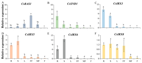 Expression profiles of vascular bundle development-related genes in various cucumber tissues. (A) CsBAS1, (B) CsSND1, (C) CsIRX3, (D) CsIRX5, (E) CsIRX6, and (F) CsIRX8. Significant differences (p < 0.05) are indicated by different letters above the bars (Duncan test). Data are presented as mean ± SE (n = 3). R, root; S, stem; L, leaf; FF, female flower; MF, male flower; F, fruit.