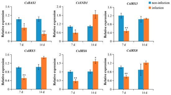 To assess the responsiveness of vascular tissue development-related genes to M. incognita infection in cucumber, the expression levels of CsIRX3, CsIRX5, CsIRX6, CsIRX8, CsBAS1, and CsSND1 in galls were analyzed using qRT-PCR, with uninfected tissues serving as the control. Based on the developmental stages of the nematodes, we selected 7 dpi and 14 dpi for our study, which are key time points for both the early establishment and later maturation of the nematode-induced galls [40]. As shown in Figure 2, CsIRX3, CsIRX5, CsIRX6, and CsIRX8 expression levels were downregulated at 7 dpi, with only CsIRX6 showing upregulation at 14 dpi, which led to its selection as the primary target for further investigation. CsBAS1 expression was significantly downregulated at both 7 and 14 dpi. Similarly, CsSND1 showed a significant decrease in expression at 7 dpi.