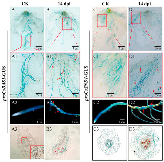 Tissue localization of CsBAS1 and CsSND1 in cucumber roots, with or without M. incognita infection, was detected at 14 dpi. (A–D) GUS staining patterns in hairy roots harboring proCsBAS1::GUS and proCsSND1::GUS constructs, with (A,C) or without (B,D) M. incognita infection. Scale bar = 5 cm. (A1–D1) Galls (indicated by red arrows) are observed in hairy roots expressing proCsBAS1::GUS (B1) and proCsSND1::GUS (D1) following nematode infection. (A2–D2) Blue GUS signals resulting from β-glucuronidase activity are present in roots (A2,C2) without M. incognita infection and galls (B2,D2) induced by M. incognita, highlighting tissue localization. (A3–D3) GUS signals in 10 μm paraffin-embedded sections of roots without (A3,C3) or with (B3,D3) M. incognita infection for proCsBAS1::GUS and proCsSND1::GUS. Annotations: N = nematode; red arrows indicate galls; pentagrams indicate giant cells. The red frame represents an enlarged view of A3.
