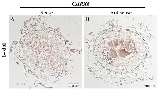 Since the promoter of CsIRX6 (Csa1G015700) could not be successfully cloned, an alternative approach, in situ hybridization, was employed to evaluate the mRNA expression of the CsIRX6 in root galls. The experiment was conducted as described by Sui et al. [69], with modifications. Fresh cucumber root galls were prepared and fixed with 50% FAA and subjected to vacuum infiltration for 15–30 min until the samples settled at the bottom. Then, the medium was replaced with fresh fixative medium and continuous shaking was applied at 4 °C overnight. Afterward, we proceeded with embedding, sectioning, and mounting the sections, followed by the hybridization experiment. Digoxigenin-labeled sense and antisense RNA probes were generated by PCR amplification using SP6 and T7 RNA polymerase (Basel, Switzerland, Roche, 10881767001). The primers are listed in Supplemental Table S1.
