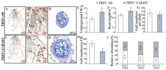Suppression of CsBAS1 through VIGS promoted root development and enhanced gall size at 14 dpi with nematode infection. (A,A1) Root phenotype of control plants (TRSV::00) inoculated with M. incognita. (C,C1) Root phenotype of CsBAS1–silenced plants (TRSV::CsBAS1) inoculated with M. incognita. (B,D) Gall sections stained with toluidine blue. Pentagram indicates giant cell. Comparison of underground weight (E), root length (F), gall numbers per plant (G), gall numbers/g FW (H), and gall size abundance (I) in TRSV::00 and TRSV::CsBAS1 inoculated with M. incognita at 14 dpi. Significant differences are indicated as follows: * p < 0.05 (Student’s t–test). Data are shown as mean ± SE (n = 15).
