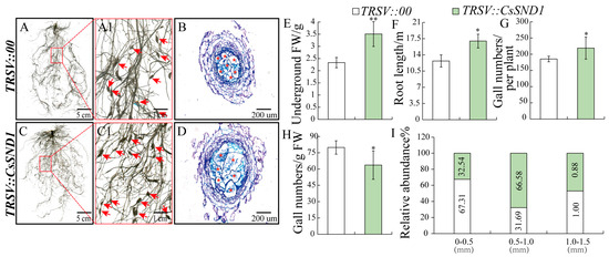Suppression of CsSND1 through VIGS promoted root development and enhanced gall size at 14 dpi with nematode infection. (A,A1) Root phenotype of control plants (TRSV::00) inoculated with M. incognita. (C,C1) Root phenotype of CsSND1–silenced plants (TRSV::CsSND1) inoculated with M. incognita. (B,D) Gall sections stained with toluidine blue. Pentagram indicates giant cell. Comparison of underground weight (E), root length (F), gall numbers per plant (G), gall numbers/g FW (H), and gall size abundance (I) in TRSV::00 and TRSV::CsSND1 inoculated with M. incognita at 14 dpi. Significant differences are indicated as follows: * p < 0.05, ** p < 0.01 (Student’s t-test). Data are shown as mean ± SE (n = 15).