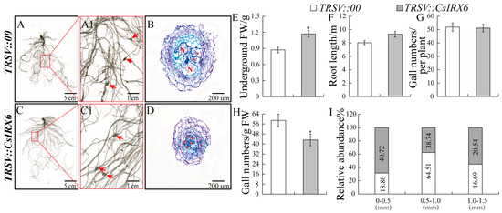Suppression of CsIRX6 through VIGS promoted root development and inhibited gall size at 14 dpi with nematode infection. (A,A1) Root phenotype of control plants (TRSV::00) inoculated with M. incognita. (C,C1) Root phenotype of CsIRX6–silenced plants (TRSV::CsIRX6) inoculated with M. incognita. (B,D) Gall sections stained with toluidine blue. Pentagram indicates giant cell. Comparison of underground weight (E), root length (F), gall numbers per plant (G), gall numbers/g FW (H), and gall size abundance (I) in TRSV::00 and TRSV::CsIRX6 inoculated with M. incognita at 14 dpi. Significant differences are indicated as follows: * p < 0.05 (Student’s t–test). Data are shown as mean ± SE (n = 15).