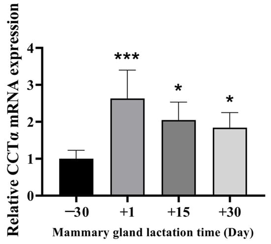 Expression of CCTα mRNA in bovine mammary glands at −30, 1, 15, and 30 d relative to parturition. All data are presented as mean ± SD; * p < 0.05; *** p < 0.001.
