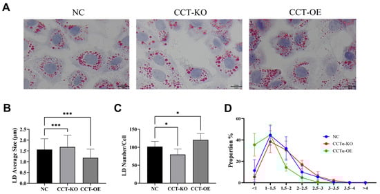 Effects of CCTα on LD size and number in BMECs. (A) Oil red O staining of LDs. LDs are shown in red, and nuclei are shown in purple-blue. (B) LD average size. (C) The average number of LDs around every cell. (D) Effects of CCTα on the proportions of LD sizes in BMECs. All data are presented as mean ± SD; * p < 0.05; *** p < 0.001.