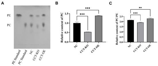Analysis of phosphatidylcholine (PC) and phosphatidylethanolamine (PE) content. (A) Thin layer chromatography analysis of PC and PE. (B) Relative content of PC. (C) PC/PE ratio. All data are presented as mean ± SD; ** p < 0.01; *** p < 0.001.
