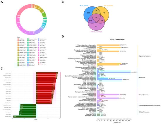 Effects of CCTα on cell lipid content and pathways. (A) Cell lipid classification. Each color represents a lipid subclass, and the color-blocked area represents the proportion of this category. (B) Amounts of differential lipids among groups. (C) Top 20 differential lipids. The abscissa is log2FC, and the ordinate is differential lipids. Red indicates up-regulation of lipid content, and green indicates down-regulation of lipid content. (D) KEGG classification map of differential lipids. The ordinate is the name of the KEGG metabolic pathway, and the abscissa is the number of differential lipids annotated to the pathway and its proportion with respect to the total annotated lipids.