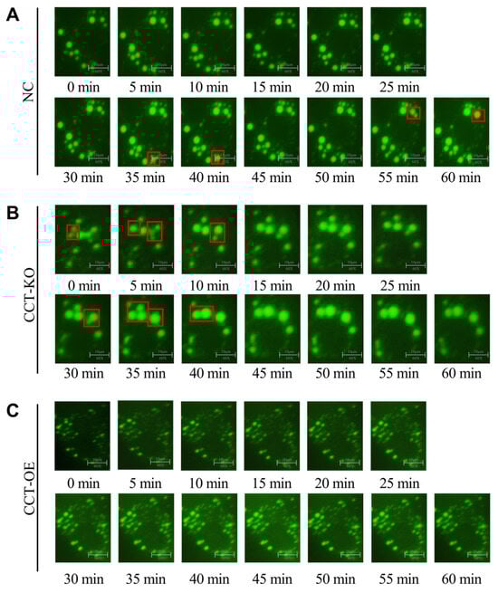 Effect of CCTα on LD fusion. (A) LD fusion in the NC group. (B) LD fusion in the CCT-KO group. (C) LD fusion in the CCT-OE group. Cells were stained with BODIPY493/503, and photographs were taken every 5 min for 60 min with a live cell workstation. Red box indicates a fusion of LD.