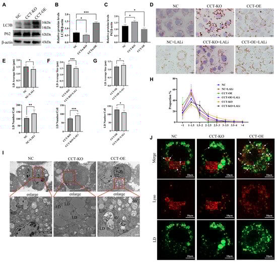 Lipophagy is an important factor regulating LD size. The expression of the autophagy marker microtubule-associated protein 1 light chain 3 beta (LC3B) was significantly elevated in the CCT-OE cells (Figure 7A–C). To confirm the role of autophagy, we inhibited autophagy with lysosome inhibitors (LALi) and detected the effects on the LD size (Figure 7D). In the NC group, lysosome inhibition significantly decreased the LD diameter and increased the number of LDs, and the proportion of large LDs decreased, whereas the proportion of small LDs increased (Figure 7E). In the CCT-KO group, LDs showed the same changes (Figure 7F) as those in the NC group, whereas in the CCT-OE group, lysosome inhibition increased the LD diameter and decreased the LD number (Figure 7G), thus decreasing the proportion of small LDs and increasing the proportion of large LDs (Figure 7H). These results suggested that autophagy in CCT-OE affects the size of LDs.
