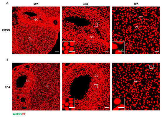 The expression of primary cilia in mouse ovaries. (A) Immunostaining of the ciliary marker Arl13B in the ovaries of PMSG-injected mice. GC: granulosa cells, CL: corpus luteum. Nuclei were counterstained with PI. Scale bars: 50 μm (main panel) and 10 μm (insets). (B) Immunostaining of the ciliary marker Arl13B in the ovaries of pseudo-pregnant mice on day 4 (PD4). GC: granulosa cells, CL: corpus luteum. Nuclei were counterstained with PI. Scale bars: 50 μm (main panel) and 10 μm (insets).