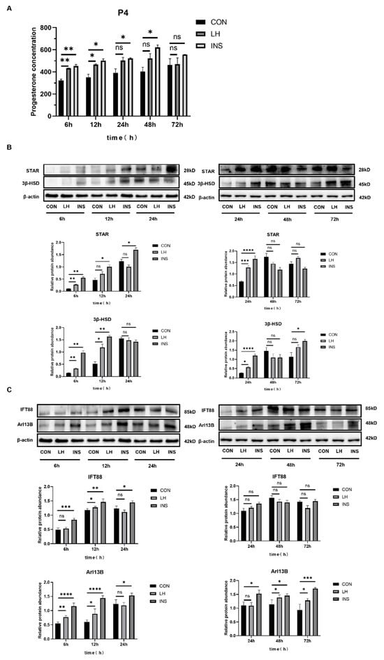 ELISA and Western blot results of in vivo induced luteinization in mouse granulosa cells. (A) Serum progesterone levels at 6, 12, 24, 48, and 72 h after injection of physiological saline, luteinizing hormone (LH), and insulin (INS) in mice. (B) Western blot analysis of STAR and 3β-HSD expression at 6, 12, 24, 48, and 72 h after injection of physiological saline, LH, and INS in mice. (C) Western blot analysis of IFT88 and Arl13B expression at 6, 12, 24, 48, and 72 h after injection of physiological saline, LH, and INS in mice. * p < 0.05, ** p < 0.01, *** p < 0.001, **** p < 0.0001, ns p > 0.05.