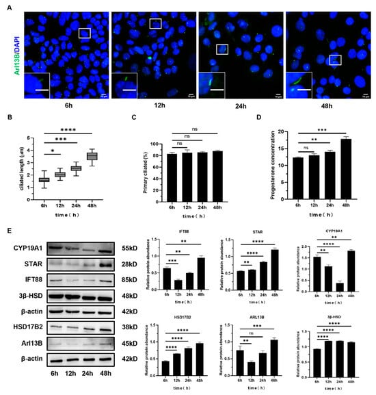 Based on these results, an insulin concentration of 2 μg/mL was selected for subsequent experiments. After 6, 12, 24, and 48 h of INS treatment, ELISA and immunofluorescence analysis (Figure 3A) showed a gradual increase in primary cilia length (Figure 3B), with no significant change in the cilia number (Figure 3C). Additionally, P4 secretion exhibited a gradual increase over time (Figure 3D). Furthermore, Western blot analysis revealed that, after 6, 12, 24, and 48 h of 2 μg/mL INS treatment, the expression of luteinization markers STAR, 3β-HSD, and HSD17B2, along with primary cilia proteins IFT88 and ARL13B, was significantly increased, while the expression of CYP19A1 was significantly decreased (Figure 3E). These findings suggest that insulin stimulation promotes the luteinization of granulosa cells, and that primary cilia may play a crucial role in this process.