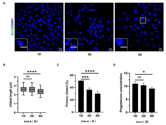 Prolonged INS treatment of granulosa cells revealed no significant changes in primary cilia length or number in the 1-day and 3-day treatment groups. However, in the 5-day treatment group, the length of primary cilia was significantly reduced (Figure 4A,B), the cilia number decreased significantly (Figure 4C), and progesterone secretion (P4) also exhibited a declining trend (Figure 4D). Combined results from Section 2.2.1 and Section 2.2.2 show that during the early stages of luteinization, the length and number of primary cilia increased in parallel with the progesterone-driven luteinization of granulosa cells. In contrast, during the later stages of luteinization, cilia gradually shortened, indicating that primary cilia play a role in regulating granulosa cell luteinization. The length and number of primary cilia dynamically change throughout granulosa cell luteinization and represent one of the regulatory factors involved in this process.