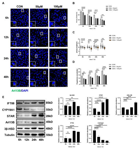 The effects of different concentrations of Ciliobrevin A (CBA) on the number and length of primary cilia and progesterone synthesis in luteinized granulosa cells. (A) Immunofluorescence staining of granulosa cells treated with 50 μM or 100 μM of CBA for 6, 12, 24, and 48 h. Cell nuclei were stained with DAPI. Scale bar: 10 μm (insets and main panel). (B) The percentage of primary cilia in granulosa cells treated with 50 μM or 100 μM of CBA for 6, 12, 24, and 48 h. (C) The length of primary cilia in granulosa cells treated with 50 μM or 100 μM of CBA for 6, 12, 24, and 48 h. (D) Progesterone secretion levels in granulosa cells treated with 50 μM or 100 μM of CBA for 6, 12, 24, and 48 h. (E) Western blot analysis of STAR, 3β-HSD, IFT88, Arl13B, and CYP19A1 in granulosa cells treated with 50 μM or 100 μM of CBA for 6, 12, 24, and 48 h. All data are presented as the mean ± SD of three independent experiments, with representative images shown. Comparisons between the two groups were made using a two-tailed t-test. * p < 0.05, ** p < 0.01, *** p < 0.001, **** p < 0.0001 ns p > 0.05.