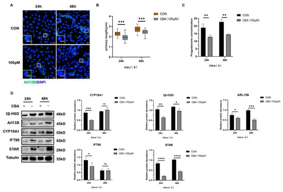 Granulosa cells were treated with 100 μM of Ciliobrevin A (CBA) for 24 and 48 h. The results showed that compared to the control group, the secretion of progesterone (P4) was reduced (Figure 6B), and the length of primary cilia shortened (Figure 6C). Western blot analysis revealed that the expression levels of luteinization markers STAR, 3β-HSD, and HSD17B2, along with the cilia markers Arl13B and IFT88, were all significantly reduced (Figure 6D).