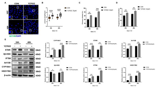 The ciliogenesis inducer Y27632 2HCl, a well-established agent known for its ability to stimulate primary cilia formation, was employed to investigate the potential role of primary cilia in the luteinization of granulosa cells. Granulosa cells were exposed to 20 μM of Y27632 2HCl for durations of 24 and 48 h. Immunofluorescence (Figure 7A) and ELISA analyses revealed that relative to the control group, treatment with 20 μM of Y27632 2HCl significantly increased the length and number of primary cilia (Figure 7B,C) and augmented progesterone secretion (Figure 7D). Furthermore, the expression levels of key luteinization-related molecules, including STAR, HSD17B2, CYP19A1, and the primary cilia proteins Arl13B and IFT88, were significantly elevated, whereas the expression of 3β-HSD remained unaffected (Figure 7E).