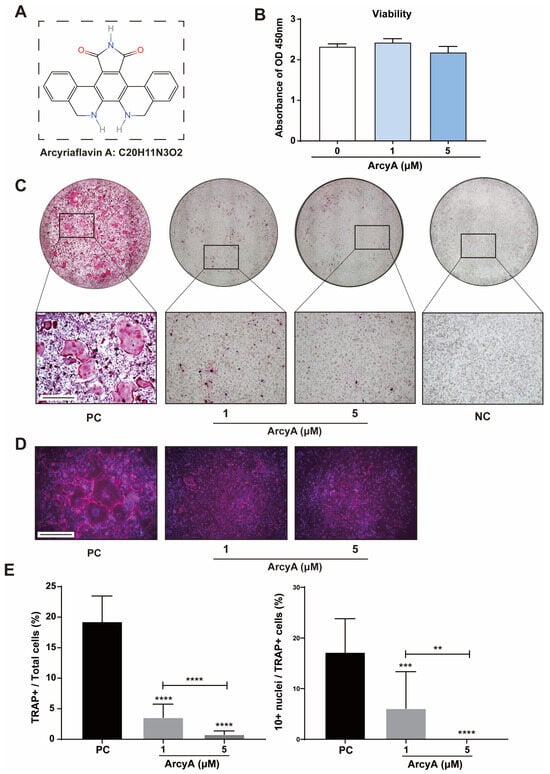 BMMs were transferred from 10 cm plates to 96-well plates at a concentration of 1 × 104 cells per well. The BMMs were cultured in 100 μL complete α-MEM medium, as described above, supplemented with 50 ng/mL M-CSF for a 24 h adaption period. Subsequently, the cells were divided into 3 groups and ArcyA was added to each group at concentrations of 0 μM, 1 μM, and 5 μM. The cells were cultured for 5 days with medium changes every two days. On day 5, 10 μL of WST-8 solution (Cell Counting Kit-8; Dojindo Laboratories, Kumamoto, Japan) was applied to 24 wells and incubated at 37 °C for 4 h. Every group included one blank control well containing 100 μL medium without cells. After incubation, the absorbance of 450 nm was measured by the SPARK® Microplate reader (Tecan Deutschland Gmbh, Crailsheim, Germany).