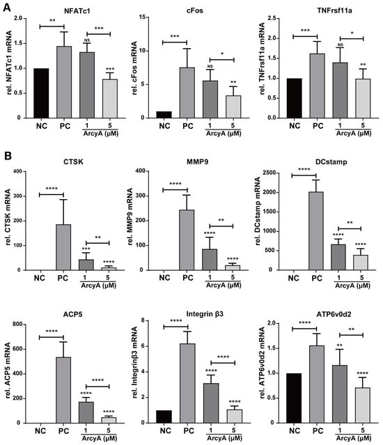 For the negative control (NC) group, the medium contained 50 ng/mL M-CSF; for the positive control (PC) group, 50 ng/mL M-CSF and 50 ng/mL RANKL; for the two treatment groups, 50 ng/mL M-CSF, 50 ng/mL RANKL, and 1 μM or 5 μM ArcyA separately. After 5 days of culture, cells were harvested using TRIzol